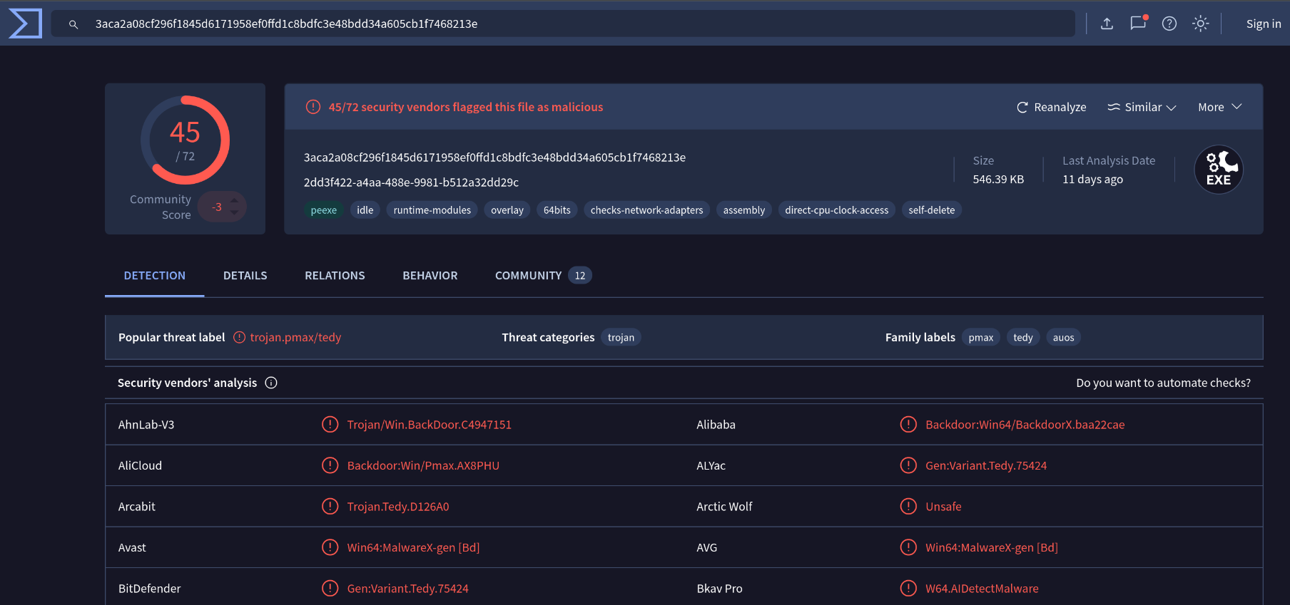 The binary hash is harshly flagged on VirusTotal
