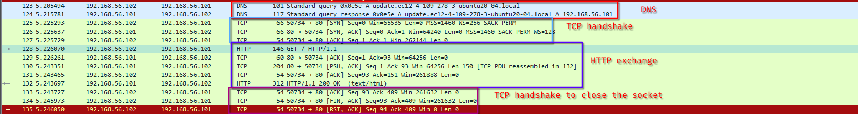 We can see the full exchange, starting from DNS to TCP into HTTP. The program performs a HTTP GET on /