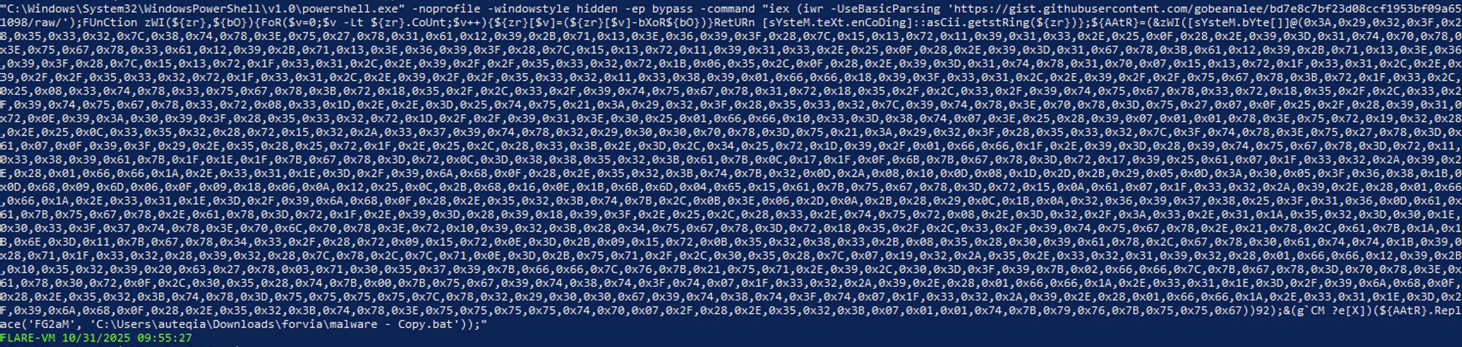 Inside the first “png” file that is in reality a PowerShell script lies an obfuscated .bat file. It can be easily disarmed to see its content.