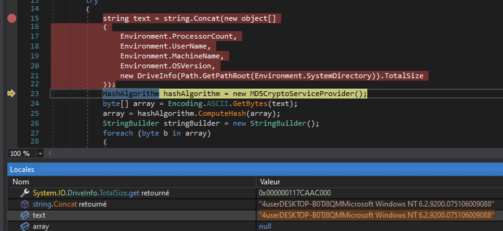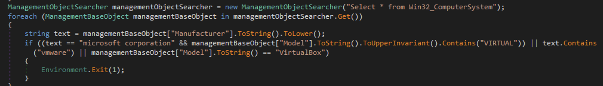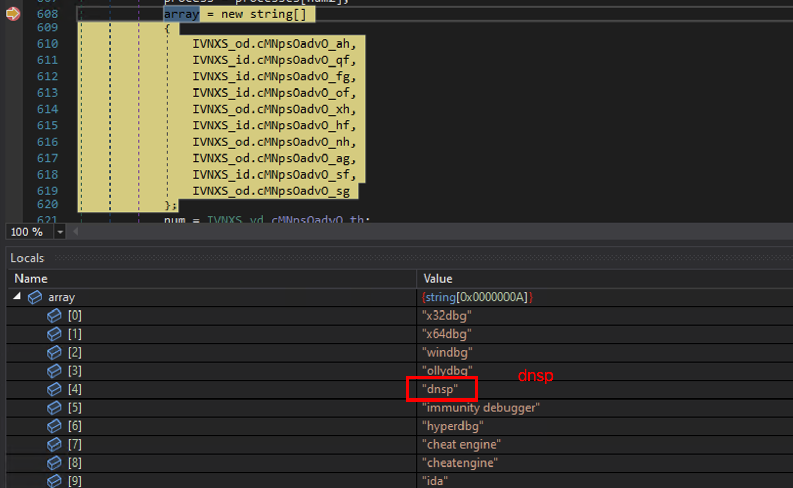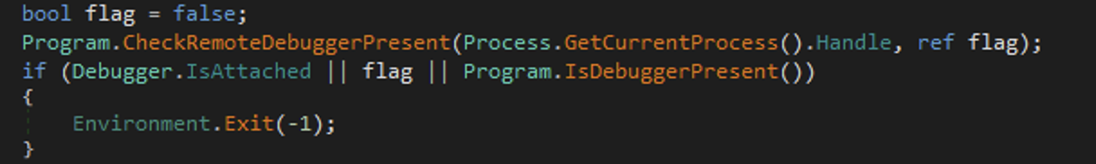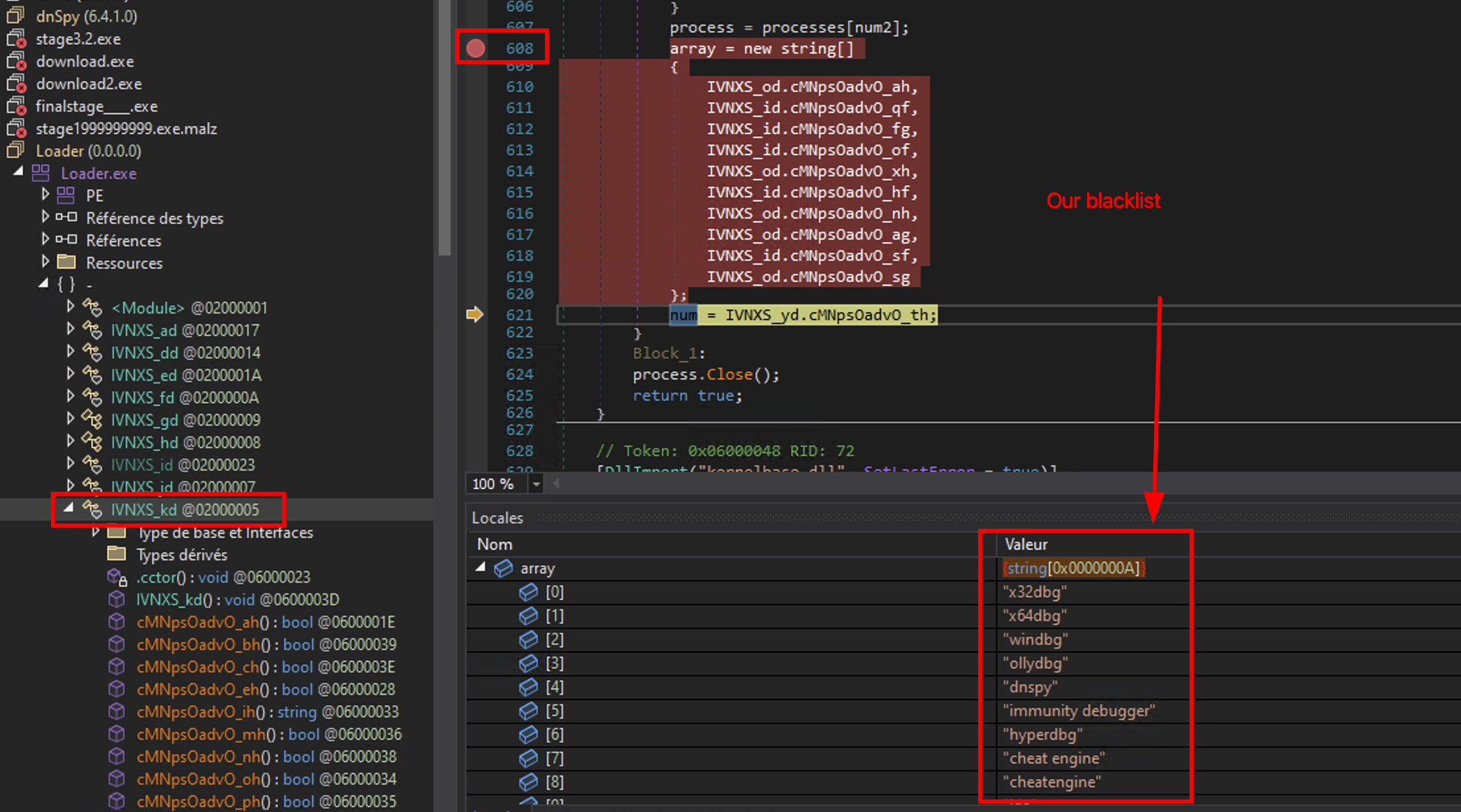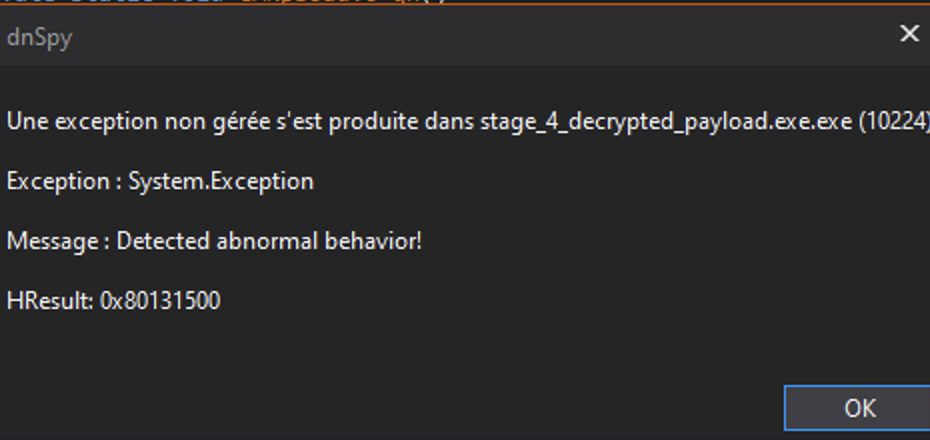 Our little loader.exe is catching a special exception if one of the following process are up and running on the host. Among them there is dnSpy, which is currently my debugger. It makes my program throwing an exception everytime I debug it.