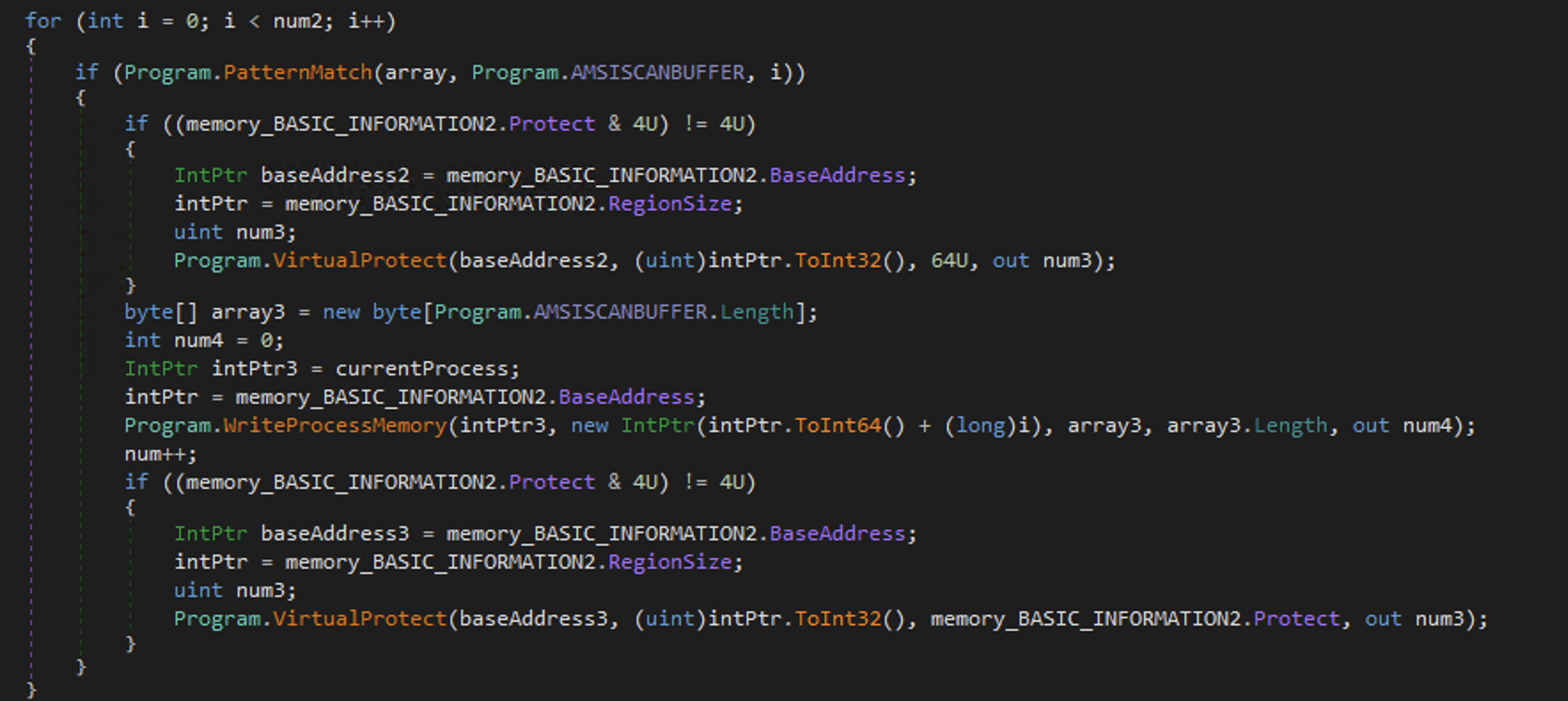 AmsiScanBuffer. Whenever it finds the AMSICANBUFFER, it changes the memory protection of this memory zone by PAGE_EXECUTE_READWRITE (64U) with VirtualProtect. It inserts null bytes in this region so it disable it basically. It modifies its own memory so thats stealthier.