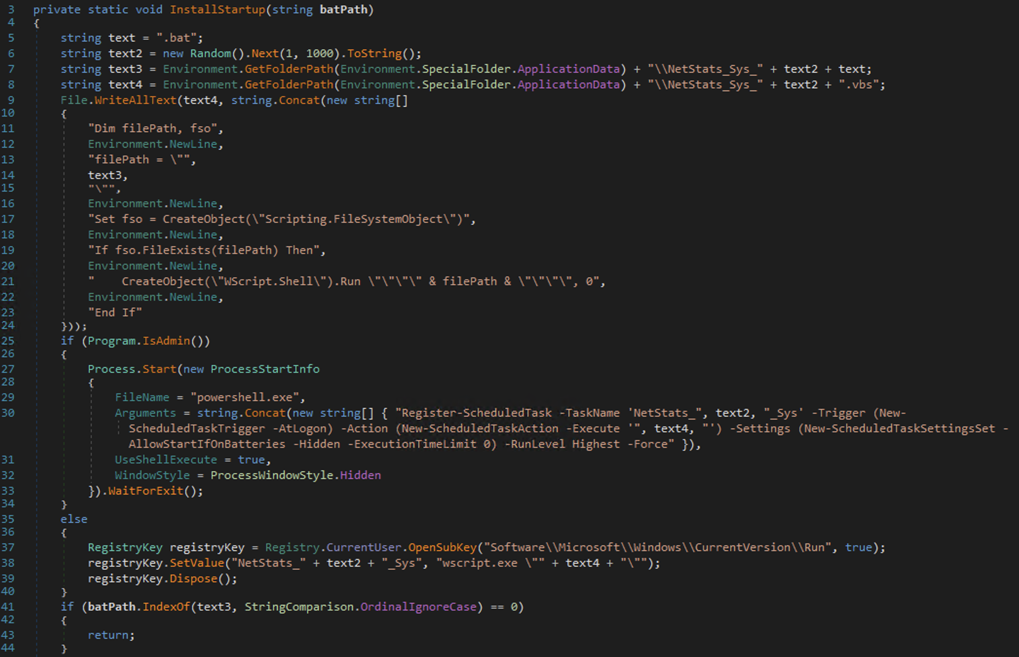 NetStats_Sys_<1-1000>.bat— the actual payload (copied frombatPath)NetStats_Sys_<1-1000>.vbs— a VBScript wrapper that launches the BAT. It is created insideInstallStartup.