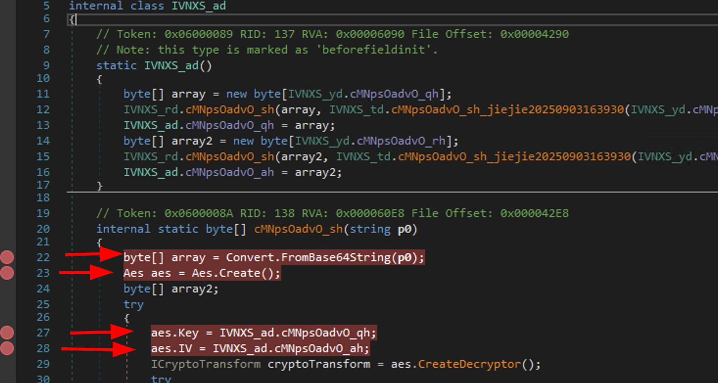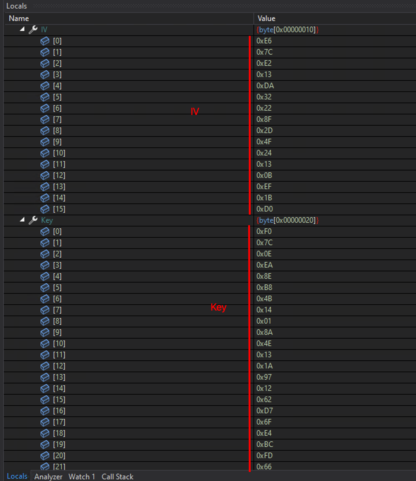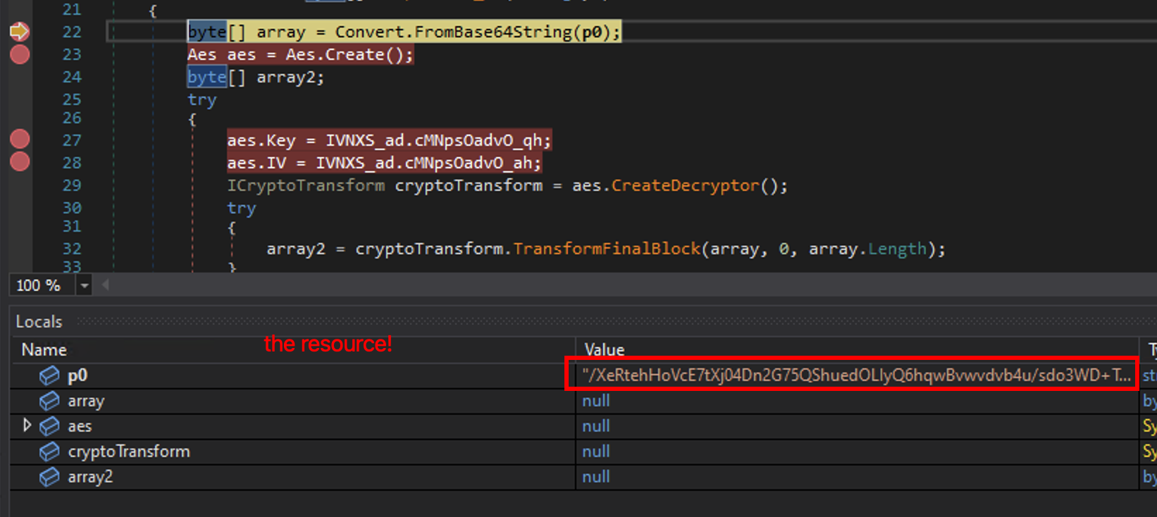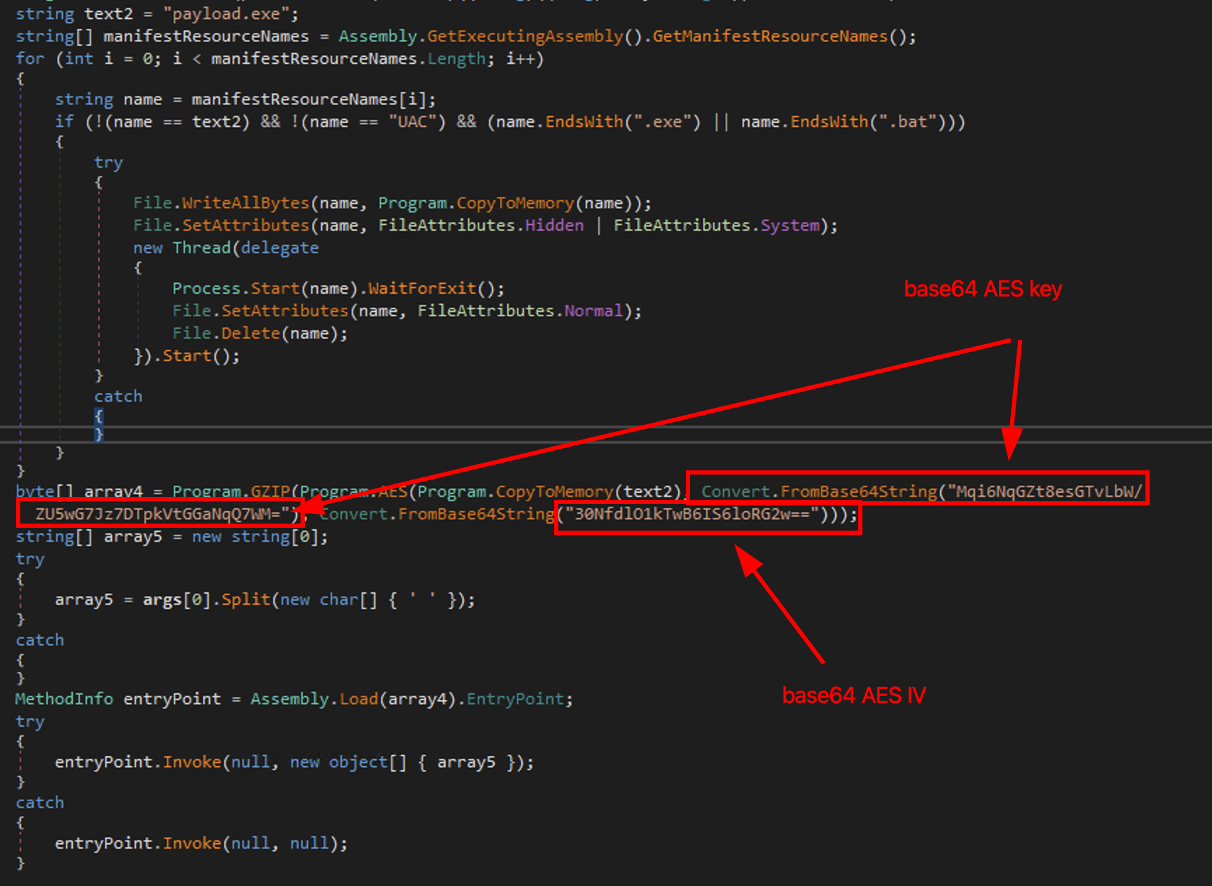 Now we have our stage 4, the previously decrypted payload.exe. For another round, the executable hides a base64 encoded and AES encrypted payload inside its resources. This time the key and IV aren’t in plain text.