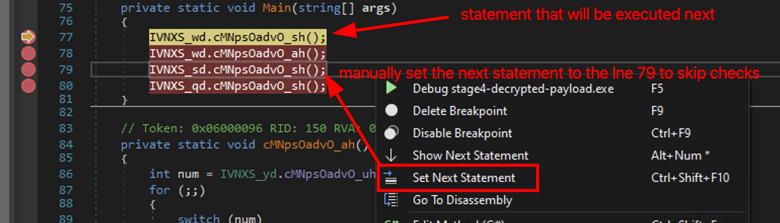 Now, whenever it hits the line 77, we can set the next instruction to the line 79 and hit Continue: