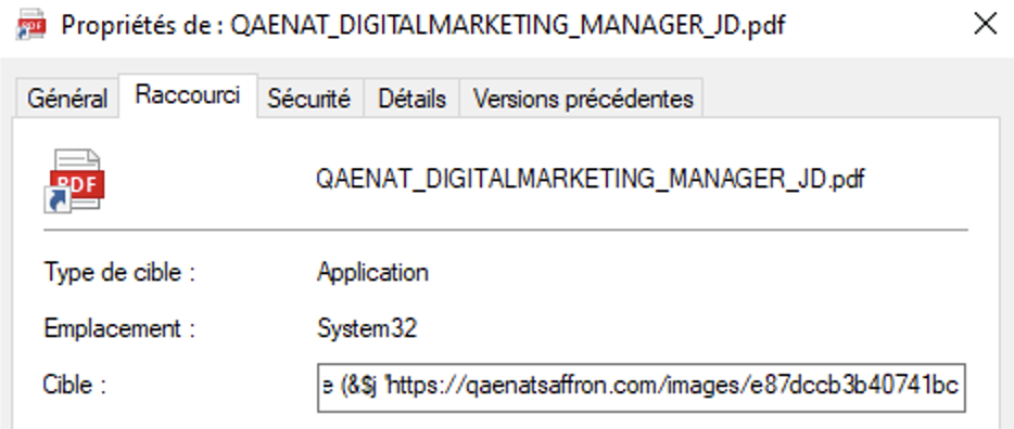 All the PNG files are legitimate but the last one, QAENAT_DIGITALMARKETING_MANAGER_JD.pdf is a Windows shortcut. When we look at it’s properties, we can see that he runs a PowerShell command line: