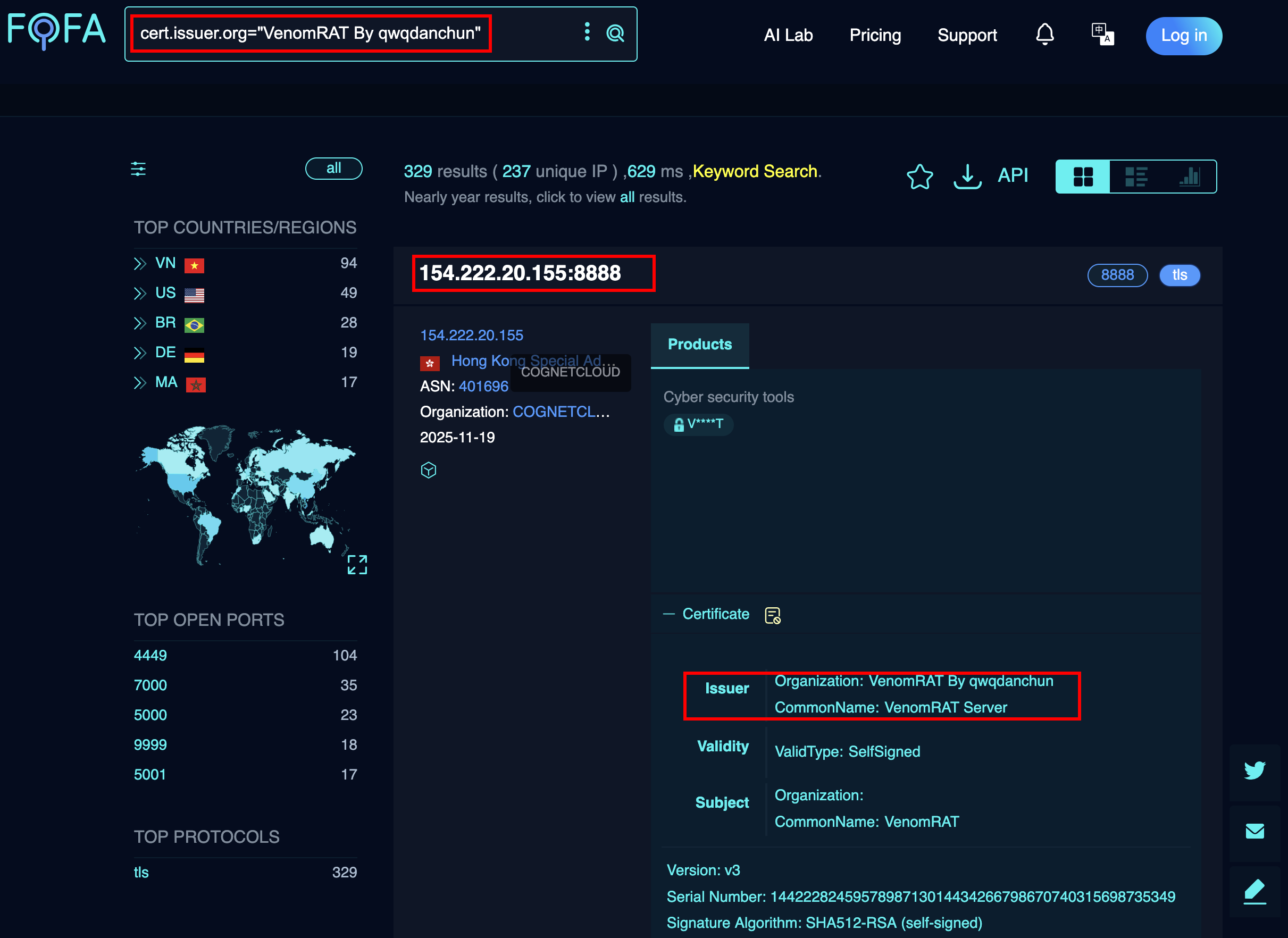 We can find other certificates based on at least two factors: The issuer,VenomRAT By qwqdanchun and VenomRAT Server. We can take a look in fofa and see: