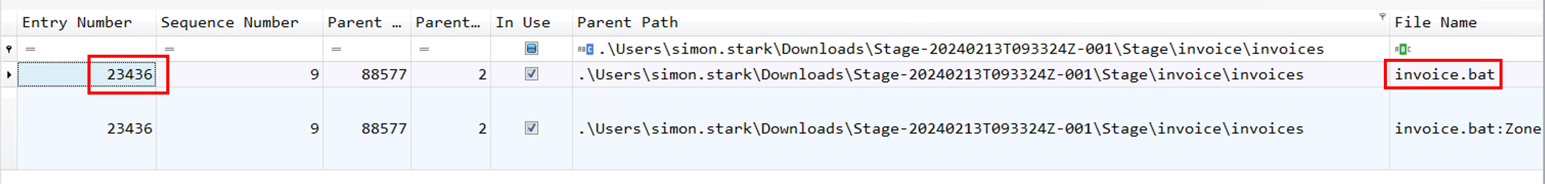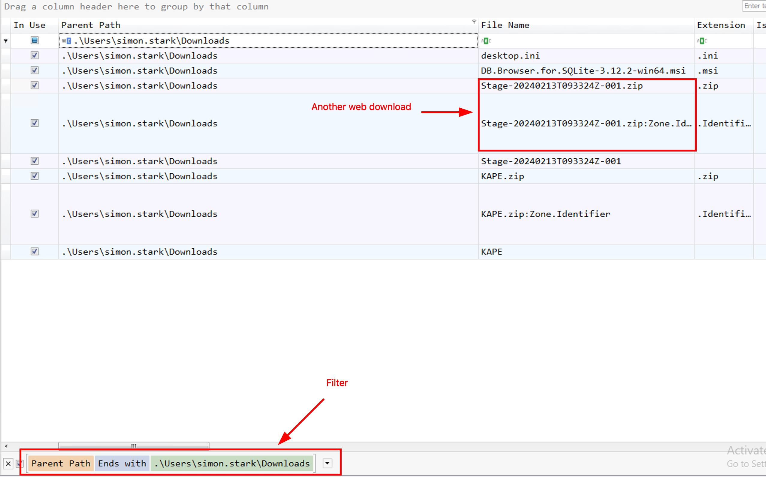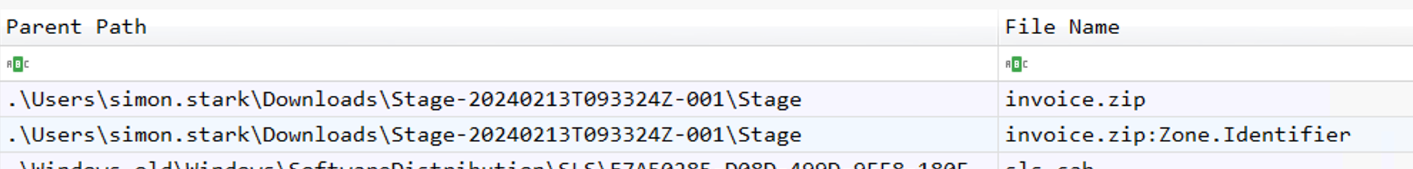 file. It’s an Alternate Data Stream (ADS) which means that the file has been downloaded from the web. But we can also see that the file is under .\Users\simon.stark\Downloads\Stage-20240213T093324Z-001\Stage