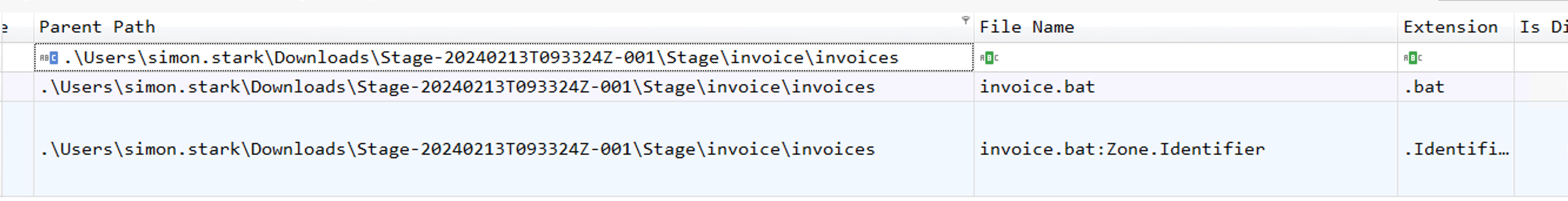 Crawling down the arborescence, we can see the extracted invoice.zip , leading to the full path of .\Users\simon.stark\Downloads\Stage-20240213T093324Z-001\Stage\invoice\invoices